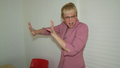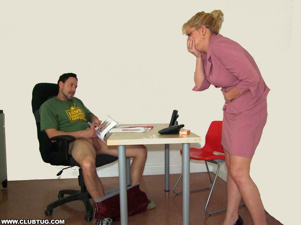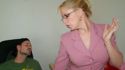 Ricky cant help but jerk his cock while looking at sexy photos of his boss. When he is caught with is cock out his boss is furious. She scolds Ricky while smoking. She jacks his cock while smoking and using his cock as an ashtray until she makes him explode all over her face. "You just jerked your way out of this job man!"