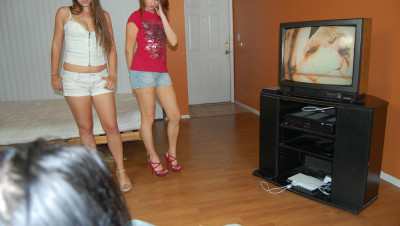 Audrey walks in on her boyfriend Jay masturbating. Audrey scolds her man, and it totally embarrassed as her friend Zoe is with her too. Zoe tells Audrey its ok and not to be embarrassed. Audrey continues to yell at Jay when he wont stop jerking it. She decides to have some fun since he wont stop, and invites Zoe to watch while she makes him jizz. When Zoe gets into it, they both get splattered as his cock explodes on both of them.