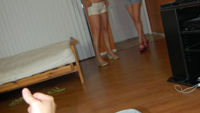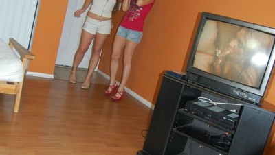 Audrey walks in on her boyfriend Jay masturbating. Audrey scolds her man, and it totally embarrassed as her friend Zoe is with her too. Zoe tells Audrey its ok and not to be embarrassed. Audrey continues to yell at Jay when he wont stop jerking it. She decides to have some fun since he wont stop, and invites Zoe to watch while she makes him jizz. When Zoe gets into it, they both get splattered as his cock explodes on both of them.