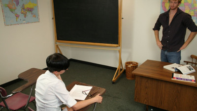 Sexy goth babe Ivy Reins gets busted in class and as punishment has to jack off the teacher. Ivy strokes his throbbing cock until her cums on her face.