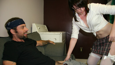 Horny college student Dakota Charms coaxes cum from some stranger in the laundry room. The slutty teen girl makes him to sit down and dominates his dick by jerking it hard until he squirts his semen.