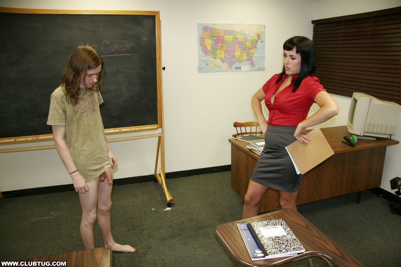 Poor Joey ends up getting detention when he passes out in his teacher classroom. Thing is, he also has a massive erection and Mrs. Comet quickly takes matters into her own hands by stroking his massive 8 inch dick. he eventually nuts a massive load all over her hands.