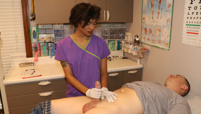 John is in for his exam when the doc steps our for an emergency. Luckily Nurse Barnes is available to extract the needed samples. She pulls out his hard cock and milks him with latex gloves, stroking his hard cock until he accidentally explodes his semen, shooting his goo over his shirt. Nurse Jasmine believes shes has enough for a sample.