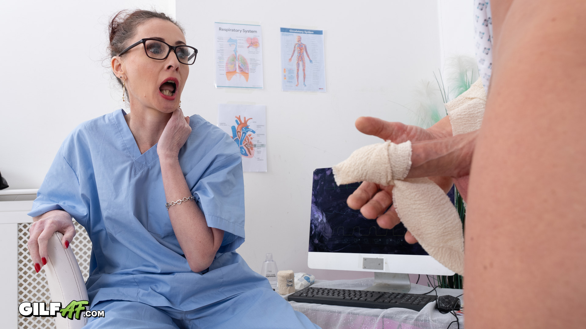 What starts as a sprained arm from jerking off too many ends in a deep fuck session for hot granny nurse Scarlet Louse. The skinny nurse takes care of the big cock younger patient in her own special way. She gets fucked deep and hard with a messy creampie in every sex position imaginable in this hot new GilfAF episode.