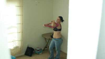 Teenie Saiya is being spied on by her neighbior hidden in her closet. As she undresses, he begins jacking off his huge cock. When Saiya opens up her closet she is sprayed with mountians off man goo. To the peepers suprise, Saiya begins jacking and sucking on his cock, milking out even more creamy jizz.