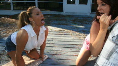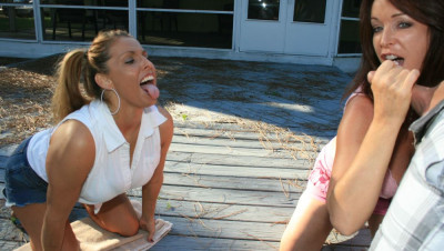 Mrs. Steele and Mrs. Starr see Jimmy wanking his wood, again right in public. In order to releive him the two curious milfs decide to milk him dry by sucking him off and taking turns blastig each other faces with his spunk.