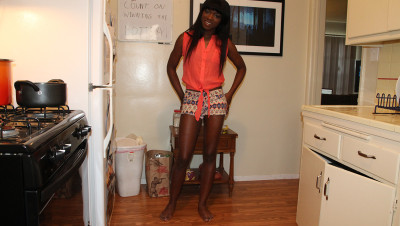 Billy visits sexy ebony Ana Foxx while she is washing the dishes at home. The hot babe is always happy to give him a handjob, so she stops washing and gets naked. Ana sits on her knees while jerking Billy's cock, asking for a facial cumshot. Billy does never say "no" to a sexy lady, so he explodes his cum in her face.