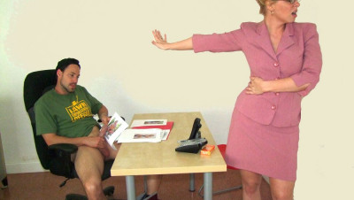 Ricky cant help but jerk his cock while looking at sexy photos of his boss. When he is caught with is cock out his boss is furious. She scolds Ricky while smoking. She jacks his cock while smoking and using his cock as an ashtray until she makes him explode all over her face. "You just jerked your way out of this job man!"