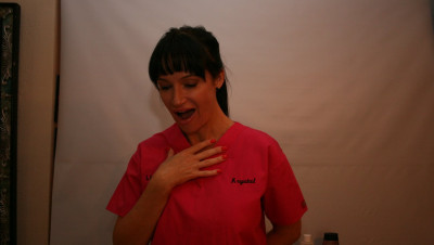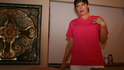 Angie just got a new job as a massage therapist when she meets Segio, the hunky new guy in town. Things go smooth until she notices his monster cock protruding through his shorts. When she tempts him, he gets even more aroused. Finally the horny milf strokes him off with a happy ending.