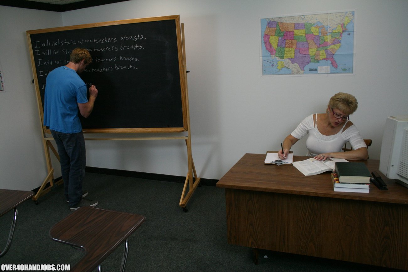 Young Jonny has misbehaved in class again, this time staring at Mrs. Tracy's gigantic juggs. The perverted teacher makes him write on the board, but when this punishemnt doesnt work, the jerks his cock only to bring him to the brink of orgasm them slapping him on the head.