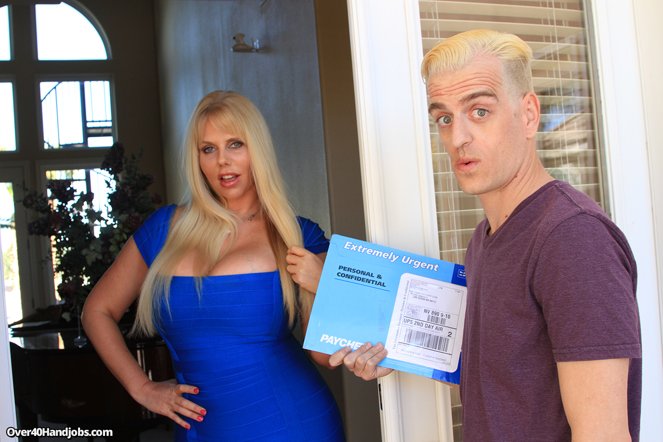 While hr hubby is away busty milf Karen Fisher loves teasing the delivery guys. When Jim arrives he gets rock hard when Mrs. Fisher answers the door. She notices his hard on and invites him in. When she teases him, he lets him fuck her monster tits while jerking him making his dick erupt with jizz.