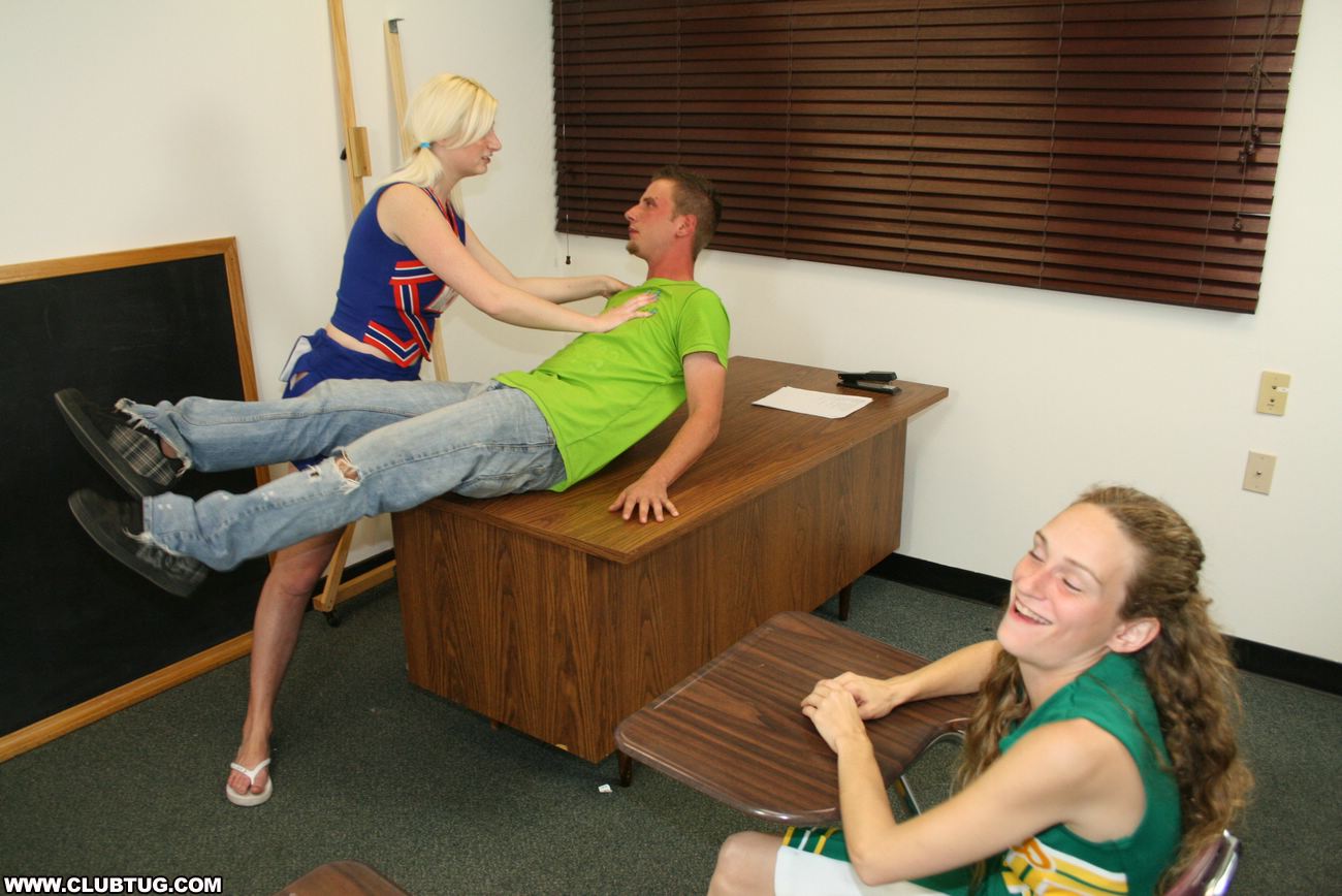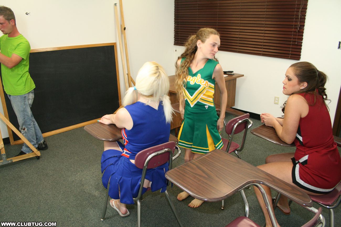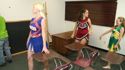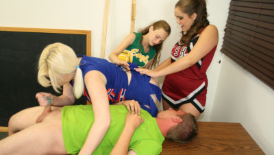 Bratty cheerleaders Barbi Katie and Hailey love a little competition. When they spot Johnny they decide to have a little competition, to see if they can make him spurt. The three sluts milk his cock dry while they cheer each other on.
