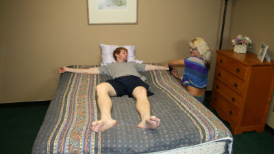 Roberta's daughter seduced her boyfriend in the bedroom. Her daughter strap his boyfriend's hand and feet then she called her mom Roberta to sucks her boyfriend's cock