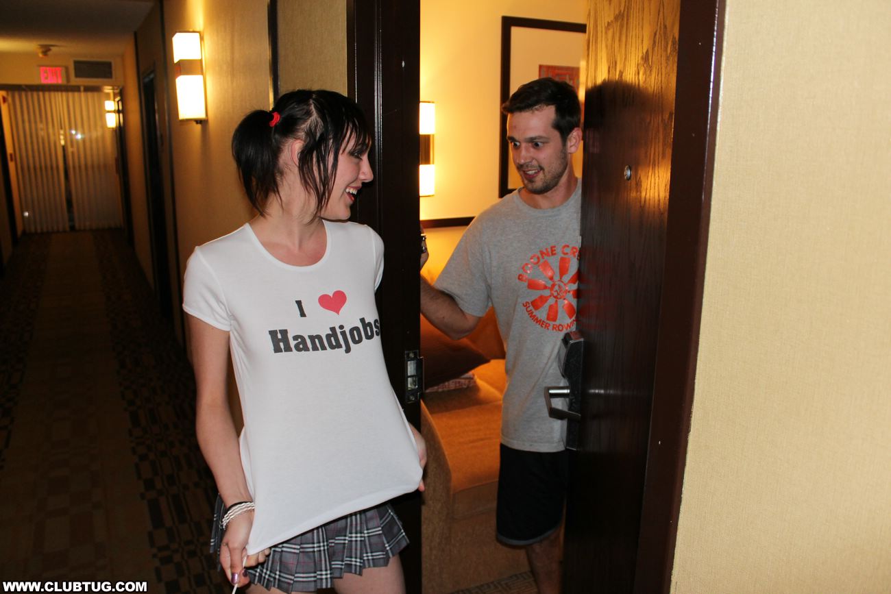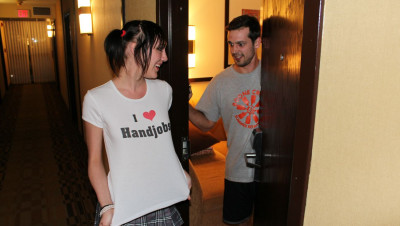 Joey is in for a big surprise when teen Mysti Moons walks in wearing her favorite t shirt. This horny cum slut loves to give wank jobs to complete strangers, and when she meets Joey and his big 8 inch dick, she milks him bone dry.