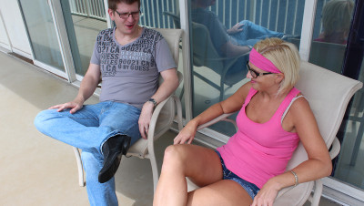 Billy dares his wife, Cheyenne Leigh, to do anything to the next door guy. The horny lady invites the stranger at their room, and starts jerking him off, while Billy, is watching. Cheyenne Leigh gives the lucky dude an awesome handjob, until he explodes with a massive cumshot.