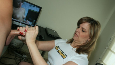 Frankie acctidentally catches Billy masturbating. She notices how nice his cock is and decides to join in by helping him jack off to his favorite porno. Billy kicks back watching his favorite porn vid while Frankie helps bust his nut all over himself!