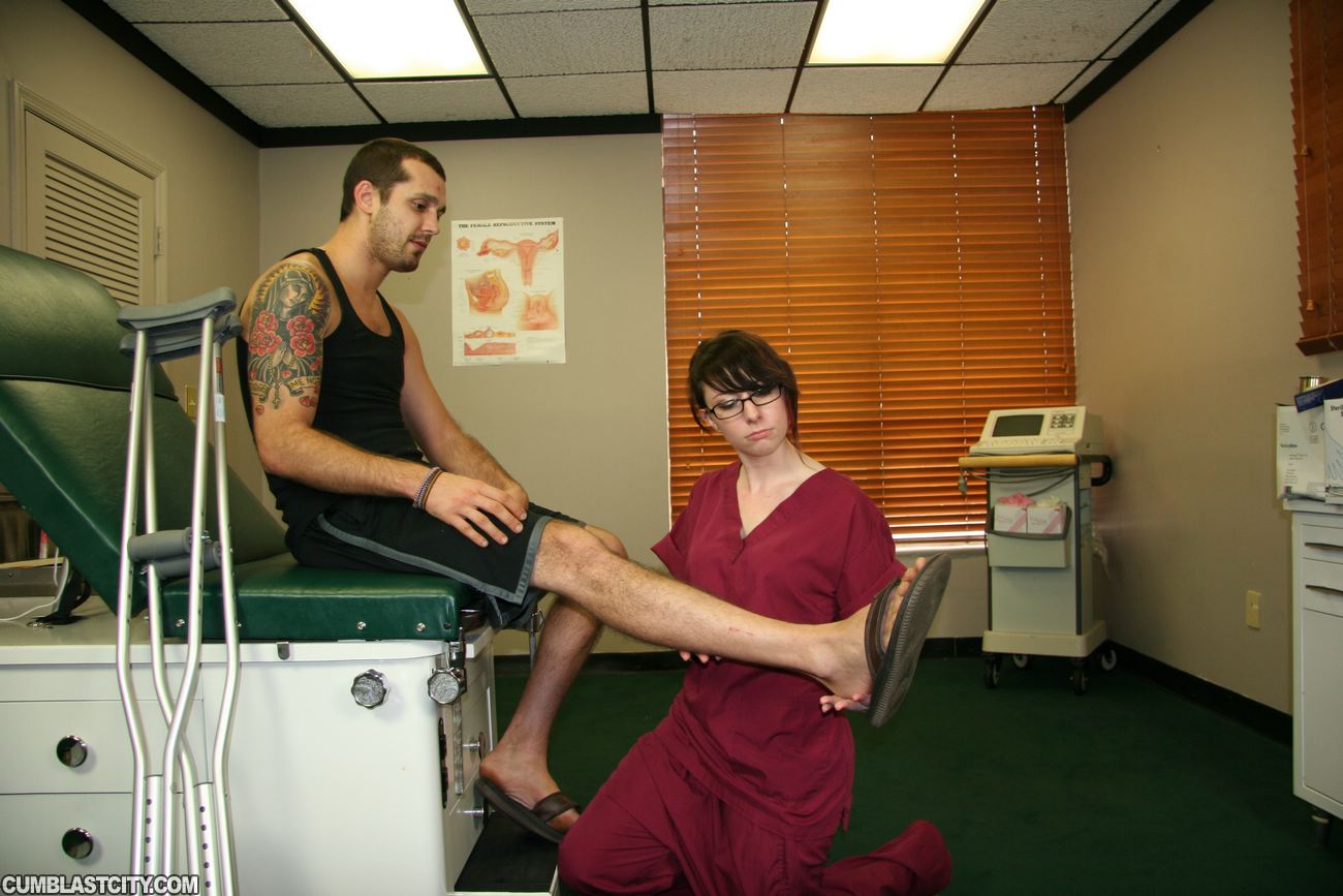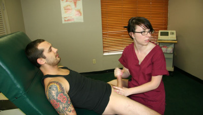 When Billy goes to see the nurse about his bum leg, he also tells nurse Dakota about his ejaculation problem. He can cum a lot more than most guys. Dakota is in shock, and curious. She closes the door behind her and starts jerking his throbbing dick to see for herself.