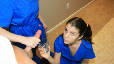 College nurses in training Sofia and JC check Mr. Johnsons sperm count. The teen nurses clean him up and begin the process of milking his cock dry. Sofia works his cock hard, while JC stands by ready to collect his salty cum for analysis.