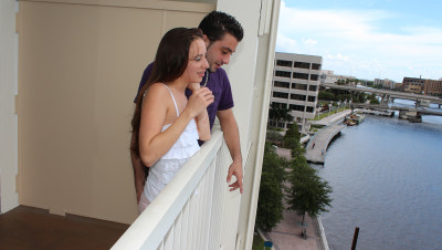 Nothing says “I missed you step bro†like a hard pounding that ends with cum sprayed all over the face. At least that's how Ashlynn Taylor explains her current situation. Her step brother has been gone from home for a while and when he returns, the gorgeous brunette babe decides to give him the gift of her pussy on the balcony in public.