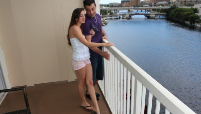 Nothing says “I missed you step bro†like a hard pounding that ends with cum sprayed all over the face. At least that's how Ashlynn Taylor explains her current situation. Her step brother has been gone from home for a while and when he returns, the gorgeous brunette babe decides to give him the gift of her pussy on the balcony in public.