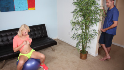 Aubrey Gold's morning workout turns into masturbation, but this is only the beginning. When the sexy blonde teen notices her step-brother lurking while jerking off at the same time, she decides to give him a hand. Aubrey sucks his monster-sized cock and then that handsome man fucks her wet pussy making her scream like crazy.