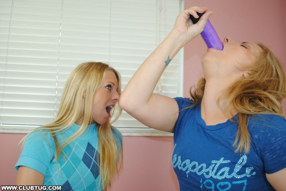 Curious teens Lexi and Krissy fondle each other when they whip out a massive dildo. When the teens spot the neighbor boy, they coax him to pul it out. He hesitates at first, but when the teens start rubbing their pink pussys together, he starts jacking off in front of them. The teens want to see who give the best hand job, as they take turns jacking and pumping until his cock spurts salty semen all over them.