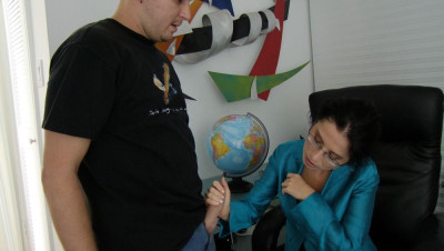 When John and his loving wife visit a sexy milf for a meeting, things get out of hand when wife Emily notices Johns big boner. Wife Emily gets excited too, and the couple coaxes milf Tatiana into getting naughty. The two tag team his cock in a duel off to see who can make John cum first, his loving wife, or the sexy executive.