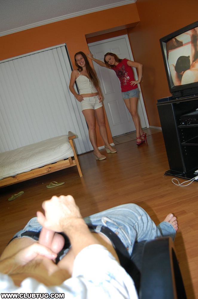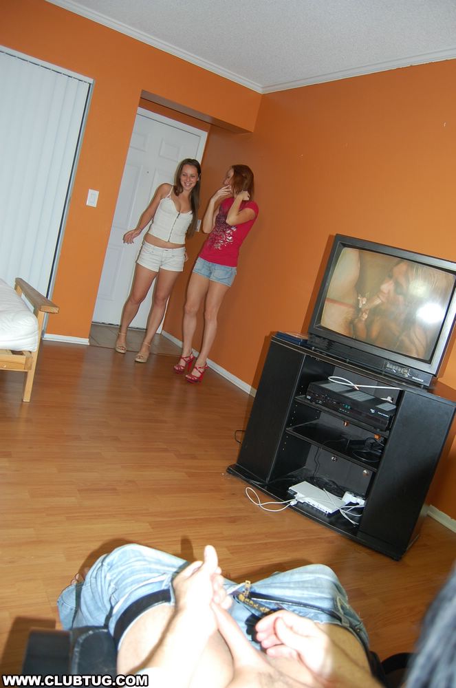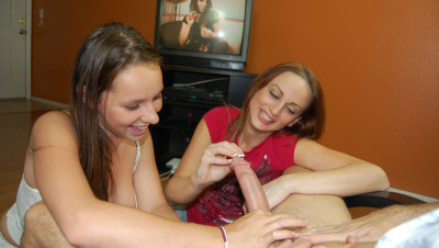 Audrey walks in on her boyfriend Jay masturbating. Audrey scolds her man, and it totally embarrassed as her friend Zoe is with her too. Zoe tells Audrey its ok and not to be embarrassed. Audrey continues to yell at Jay when he wont stop jerking it. She decides to have some fun since he wont stop, and invites Zoe to watch while she makes him jizz. When Zoe gets into it, they both get splattered as his cock explodes on both of them.