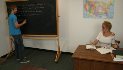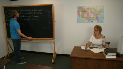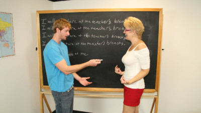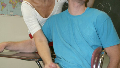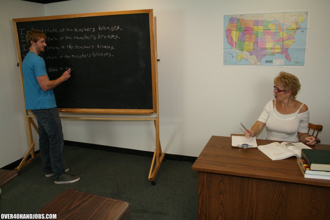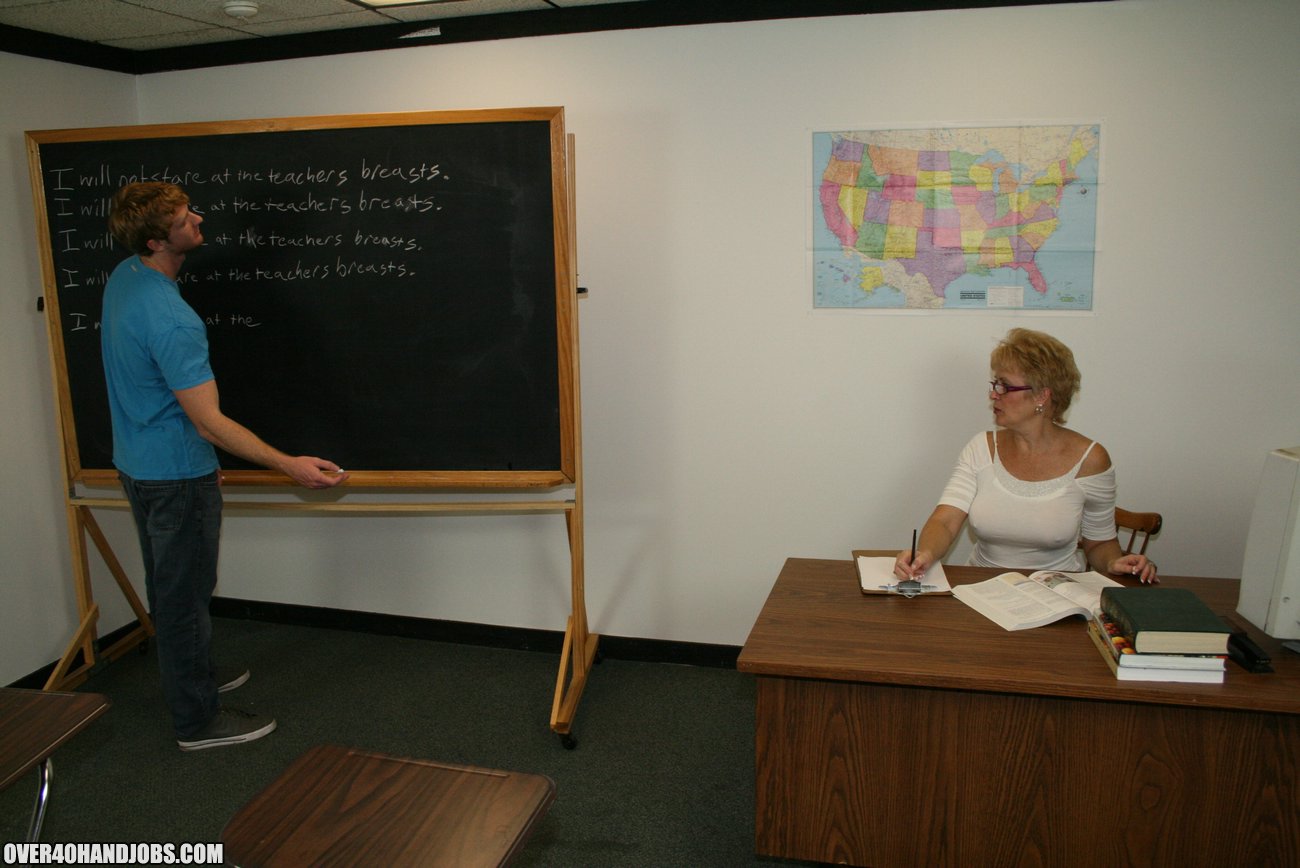 Young Jonny has misbehaved in class again, this time staring at Mrs. Tracy's gigantic juggs. The perverted teacher makes him write on the board, but when this punishemnt doesnt work, the jerks his cock only to bring him to the brink of orgasm them slapping him on the head.