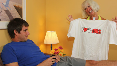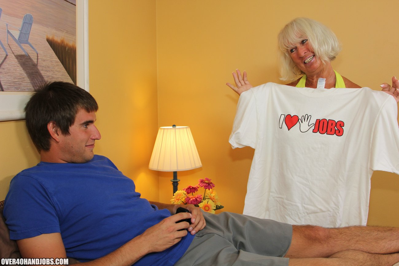 Grandma Jennie Lou catches Billys t shirt while doing laundry. The horny milf is excited by what it says and she decides to confront him. Jennie ends up giving the young lad a killer handjob when he nuts on himself.