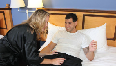 Joey loves to beat his big dick when Mrs. West is at work, unfortunately she is arriving early and walks in on Joey beating his cock in his bedroom. Mrs. West is shocked, but not that he is wanking off good and hard, but that his dick is perfect, and her pussy gets wet while watching. She now wants to see him nut, and starts to jerk him off for him.