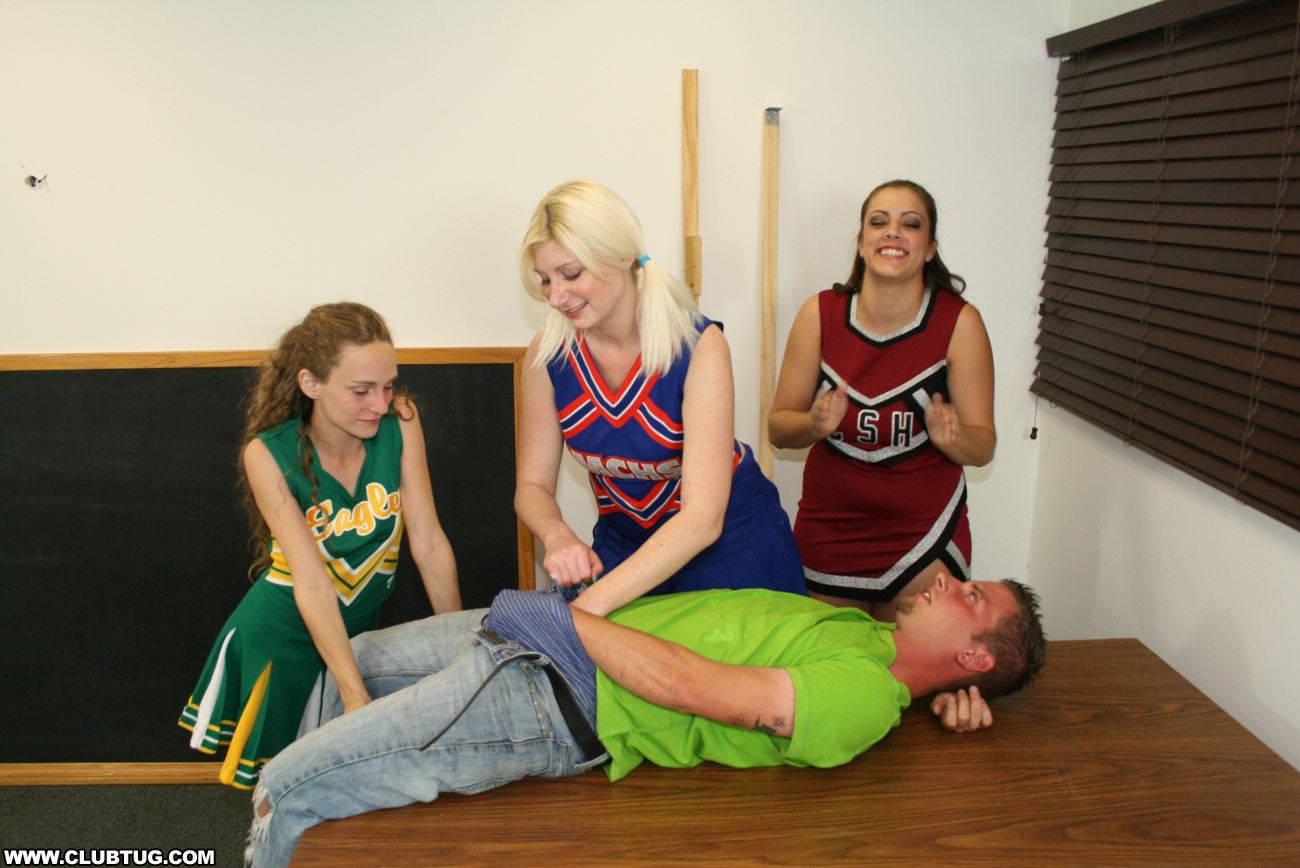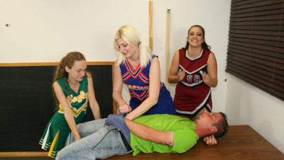 Bratty cheerleaders Barbi Katie and Hailey love a little competition. When they spot Johnny they decide to have a little competition, to see if they can make him spurt. The three sluts milk his cock dry while they cheer each other on.