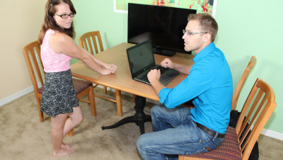 A girl's gotta make money and if that girl is a webcam model, she can't make money if her computer isn't acting right. This is the exact predicament Jennifer Bliss finds herself in halfway through her cam show so she hits up her local geek squad dude who comes right over to her rescue. The naughty brunette teen is horny as fuck and can't resist flirting with him and even though he doesn't flirt back while he works.