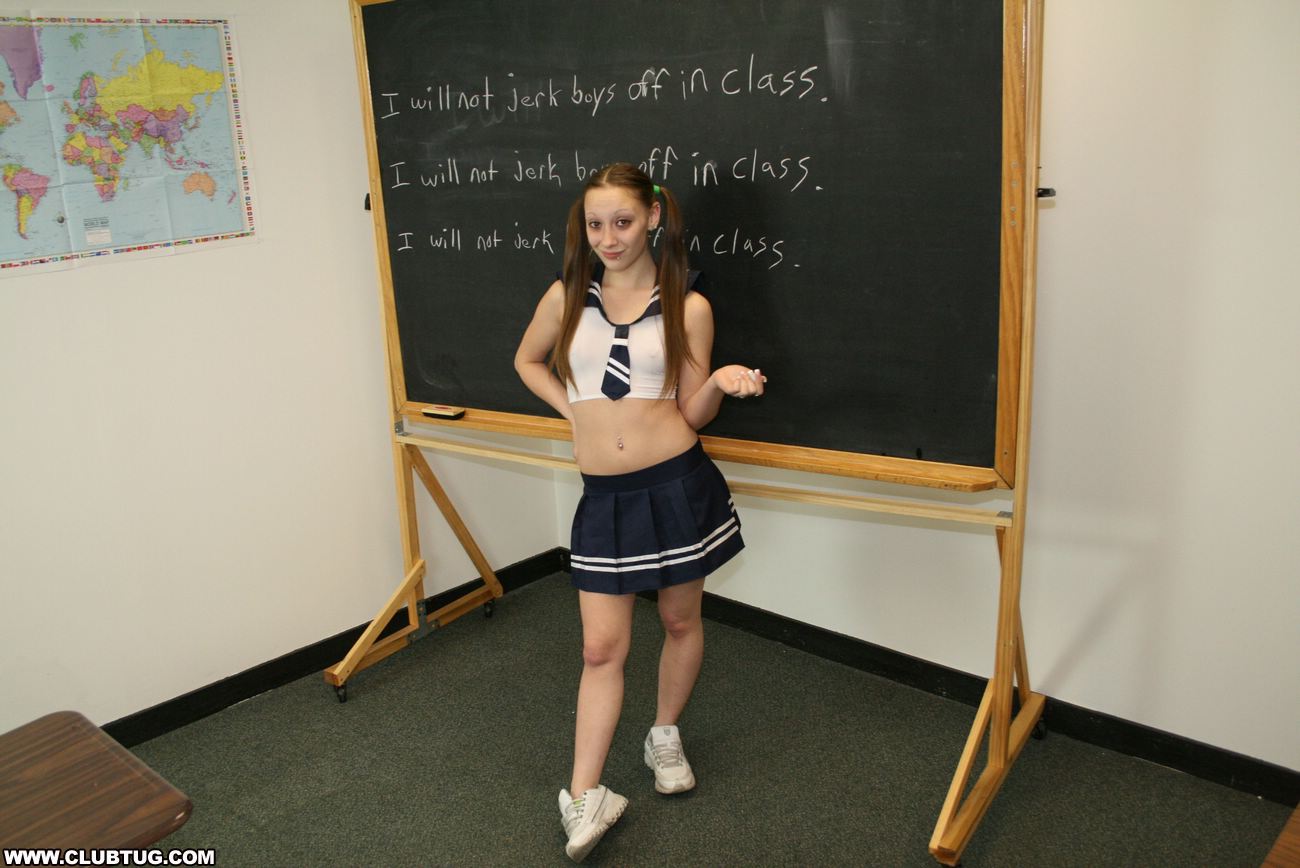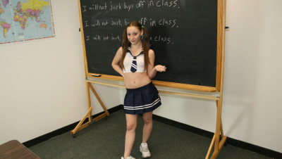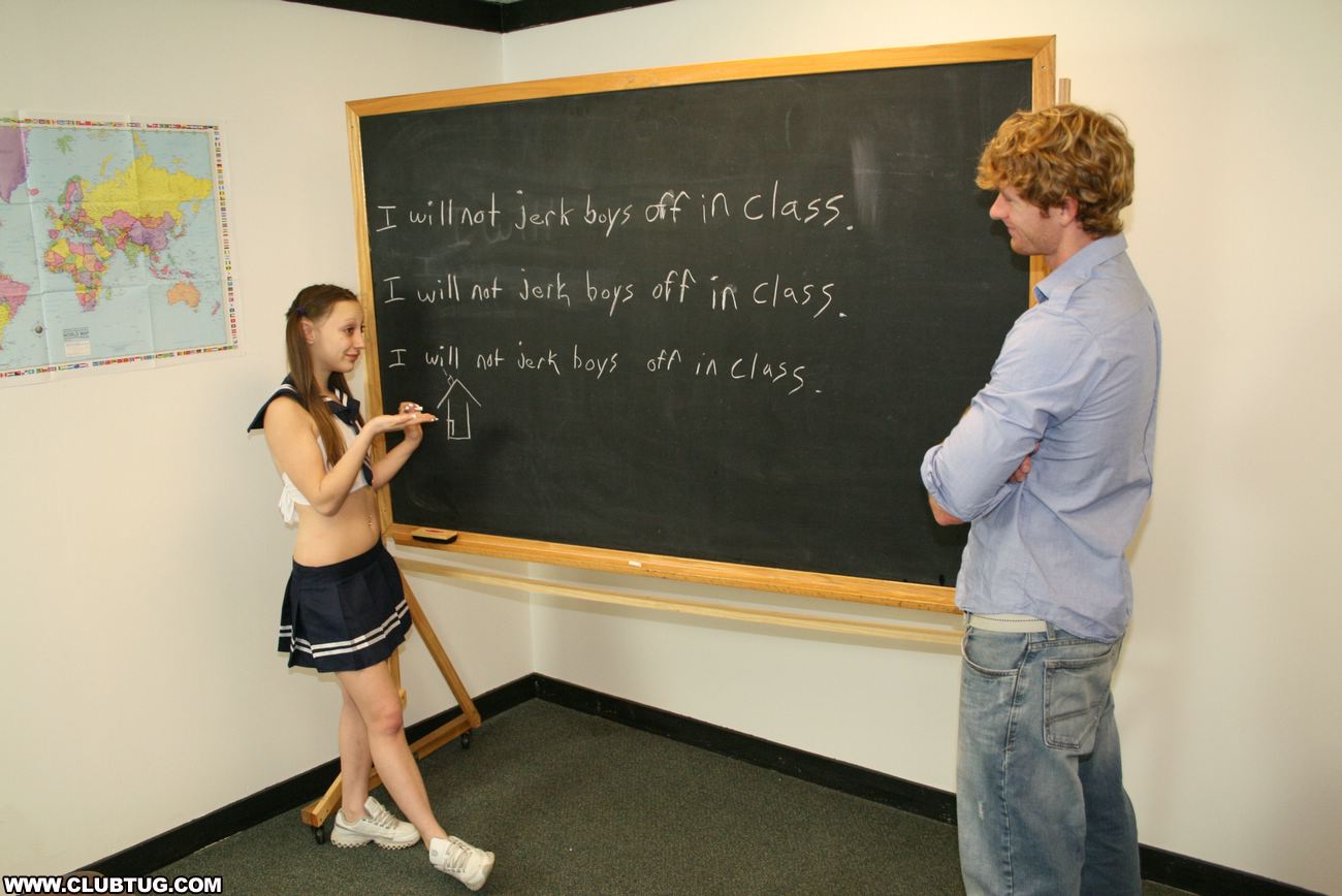 Slutty teen Brandi jerking off boys in class. She loves doing it so much till she get caught and get to write on the black board "I will not jerk boys off in class" fifty times, but she just ignored it and get another boy to jerk off