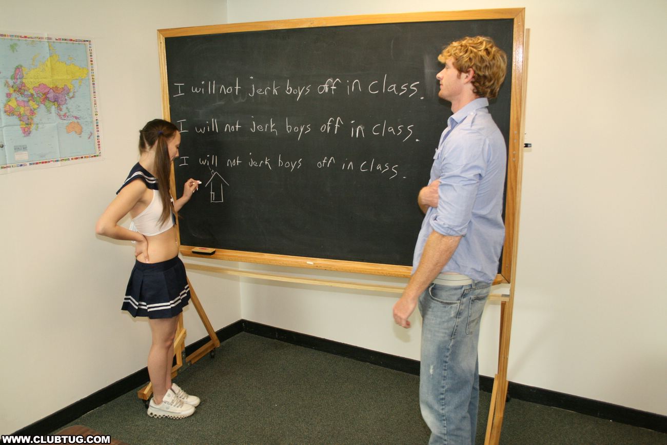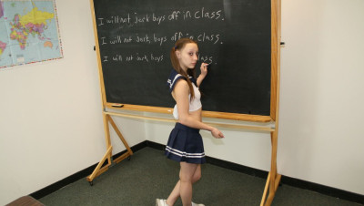 Slutty teen Brandi jerking off boys in class. She loves doing it so much till she get caught and get to write on the black board "I will not jerk boys off in class" fifty times, but she just ignored it and get another boy to jerk off