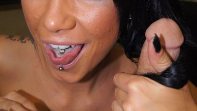 Teenage babe Tanner Mayes strokes and jacks a mega sized prick and makes him shoot goopy loads of jizz on her face and boobs.