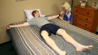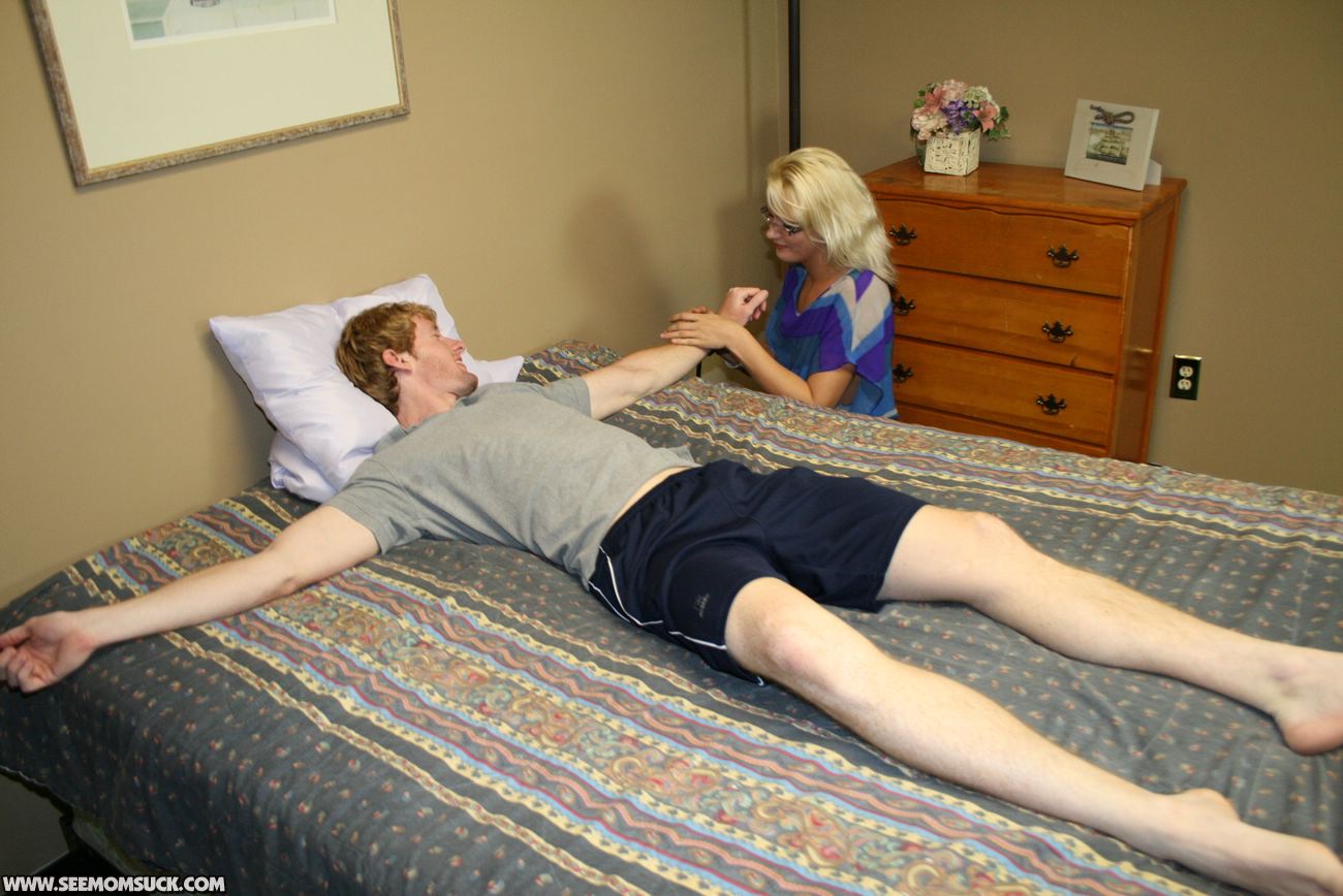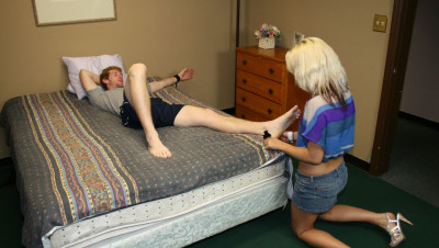 Roberta's daughter seduced her boyfriend in the bedroom. Her daughter strap his boyfriend's hand and feet then she called her mom Roberta to sucks her boyfriend's cock