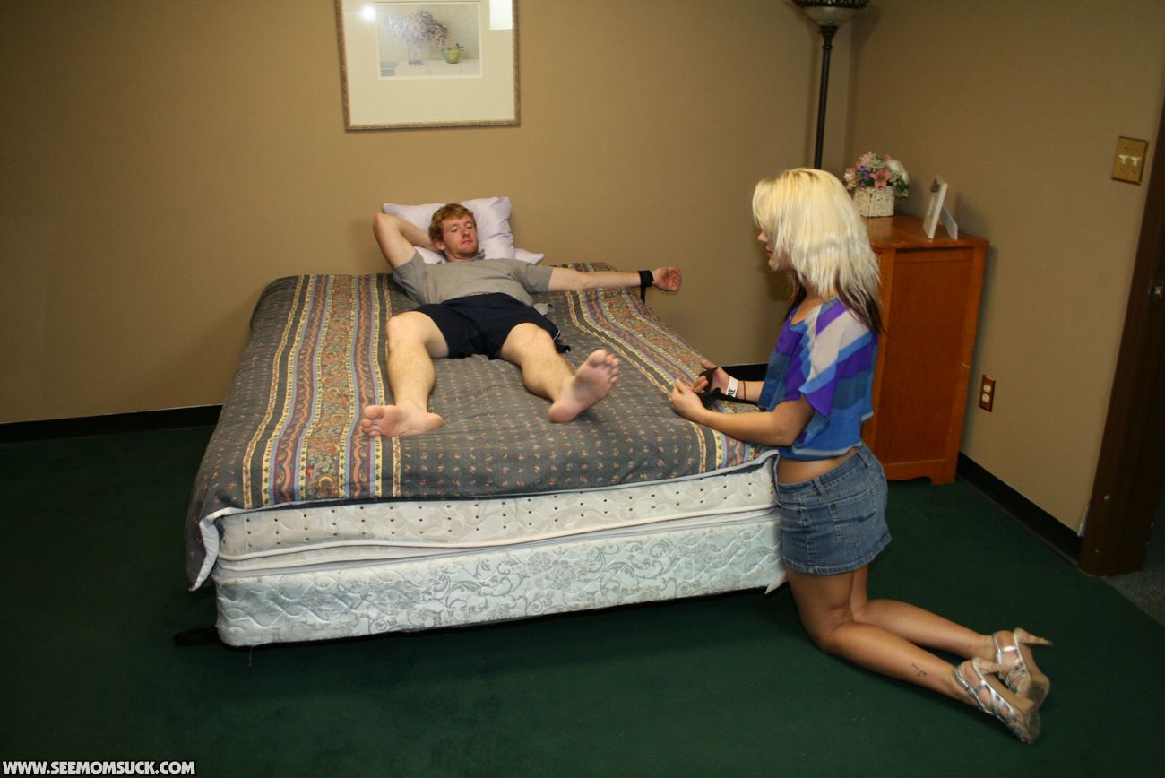 Roberta's daughter seduced her boyfriend in the bedroom. Her daughter strap his boyfriend's hand and feet then she called her mom Roberta to sucks her boyfriend's cock