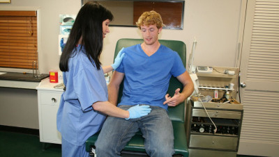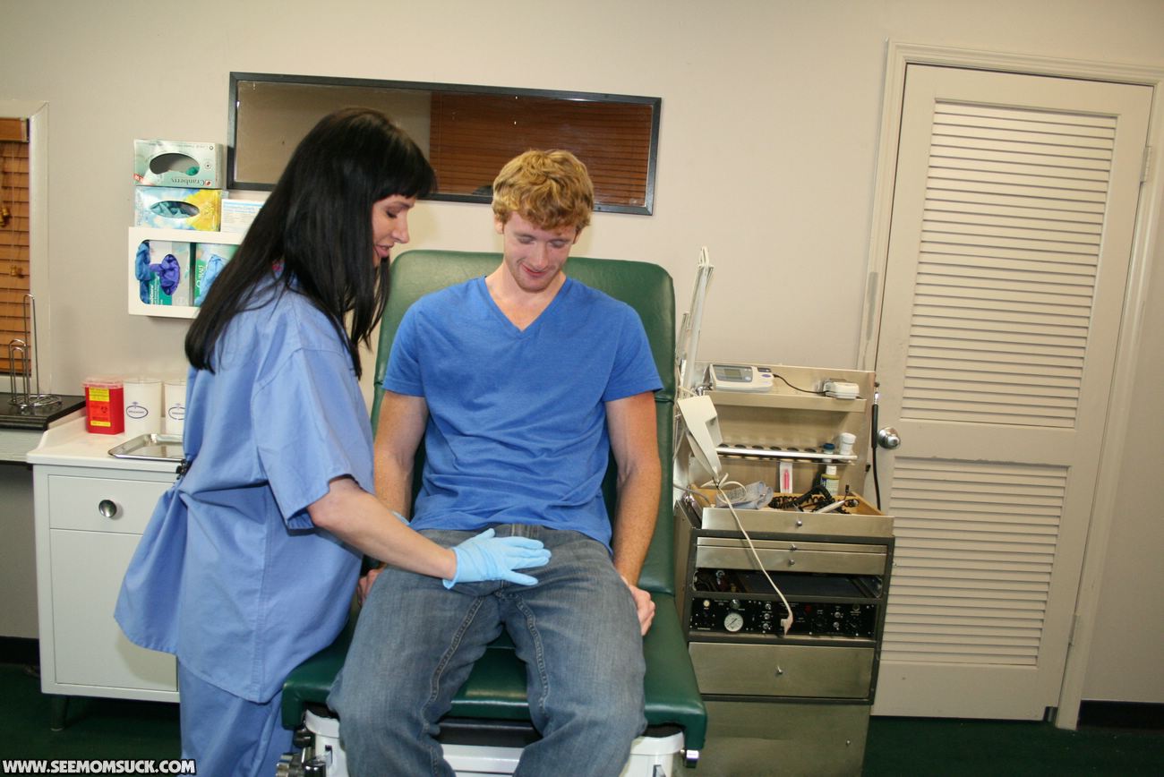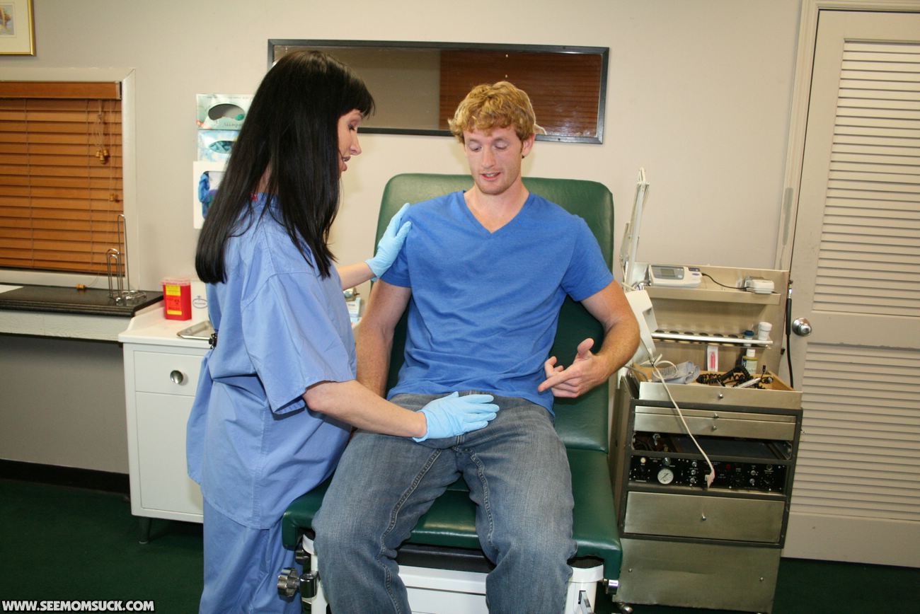 Alex takes Joey to visit his mom, a nurse at the local clinic. Mrs. Niore is shocked to see the size of Joeys dick and starts to rub it. Joey gets hard from excitement. Moments later Mrs Niore is sucking on it hard.