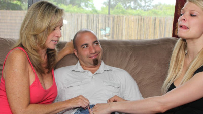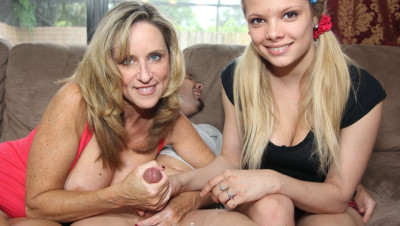 Teen babe Stella is about that age where she needs to learn the art of milking big shafts. Her perverted step-mother comes up with the idea to bring in the biggest dick in the neighborhood to teach her, Joey and his giant penis gets milked and jacked by this horny duo.