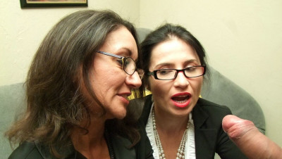 Frank is caught red handed when he gets interrupted whilst jerking off to some sexy pics he found of the two hot office secretaries Tatiana and Persia. The two milfs scold him and yell him, until they see how large his dick is. They decide to help him bust his nut all over the computer screen by sucking and jerking him off together.