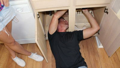 Petite blonde teen Vanessa Cage finds her butt plug inserted inside her pipes. So she calls the handy man. He is shocked at the sight, and teen Vanessa is embarrassed. He coaxes her to take off her top, and he whips out his cock while she jerks and milks him off.