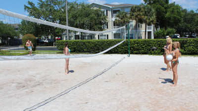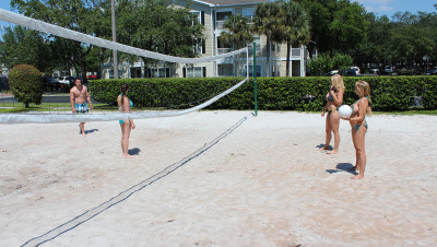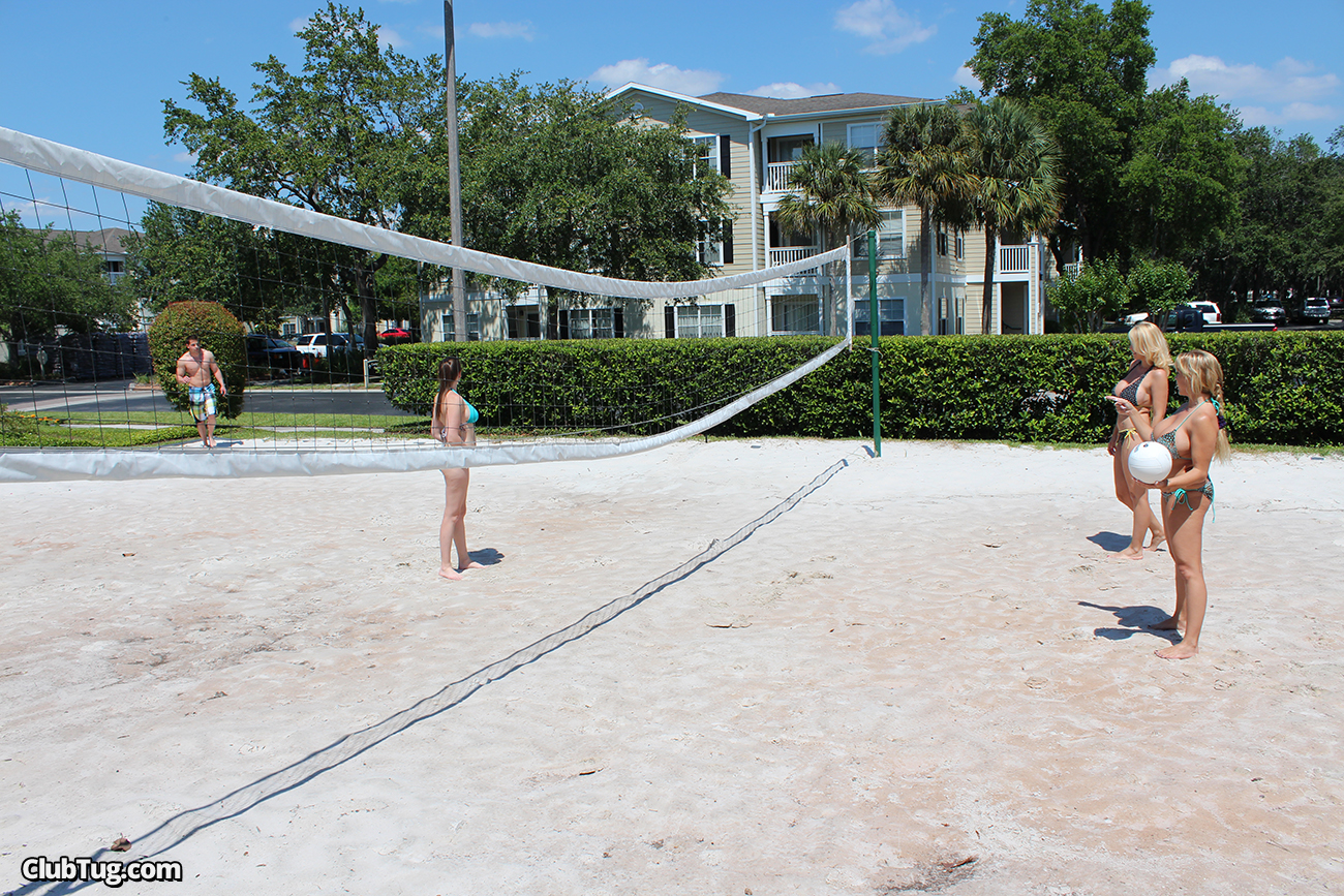 Amber Bach, Charlee Chase and Melanie Hicks are playing beach volleyball when Scott shows up the horny girls call him to play with them. They take him to their room and place him on the bed, before starting to jerk off his dick. The busty girls tag team this dick until Scott explodes his cumload on their big tits.
