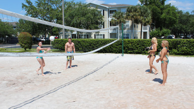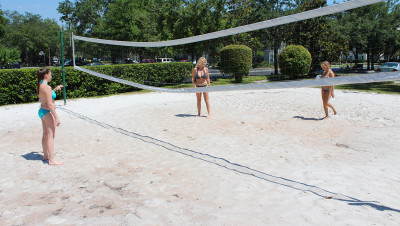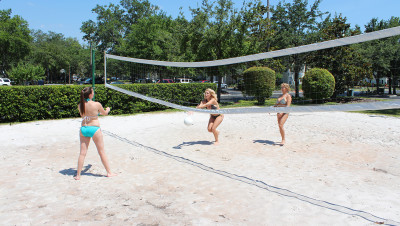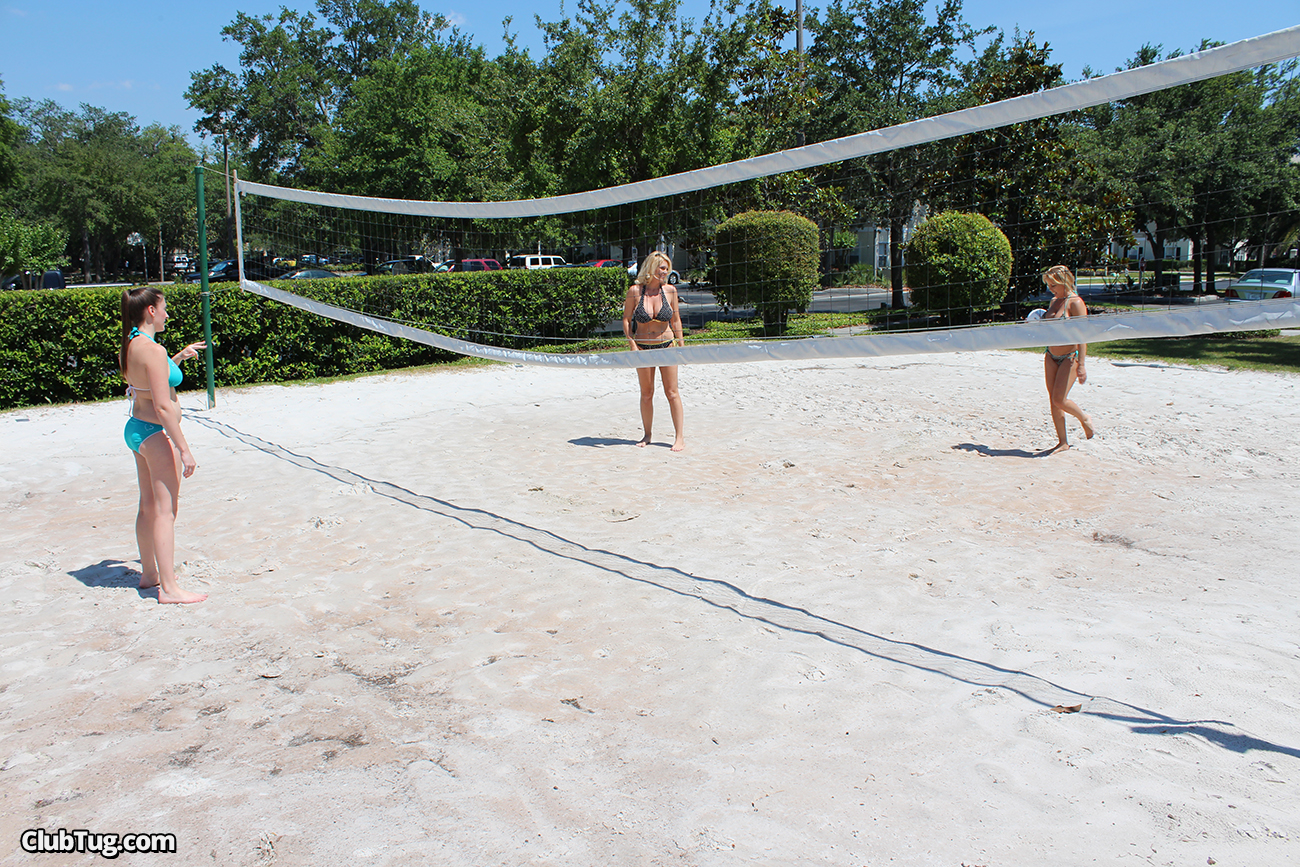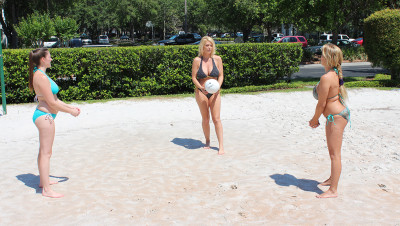 Amber Bach, Charlee Chase and Melanie Hicks are playing beach volleyball when Scott shows up the horny girls call him to play with them. They take him to their room and place him on the bed, before starting to jerk off his dick. The busty girls tag team this dick until Scott explodes his cumload on their big tits.