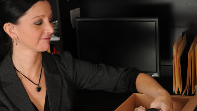 Kelly Greens package has finally arrived at her office. The naughty milf has ordered a lube. Kelly decides to make a live demonstration for him, so she takes her clothes off and uses her new lube to jerk his boner. She is sitting on her knees, giving him some great cock strokes, until she gets splattered with salty jizz.