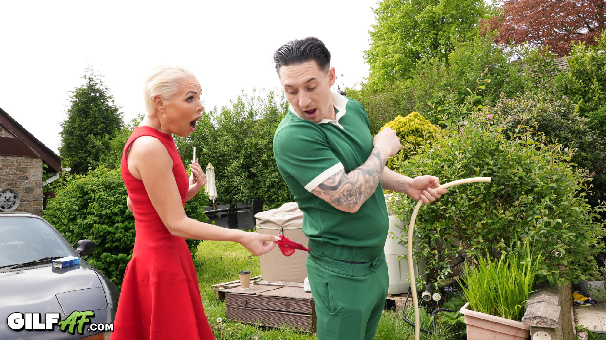 You can call her Francesca Kitten or you can call her the sex-starved socialite. Either way, this hot GILF generally doesn't like to cheat on her husband, but she's so under-sexed she'll fuck the hot gardner. Thats exactly what happens when her gardener gets busted sniffing her panties. Things go from bad to good really quick in a hot fuck session with this gilf.