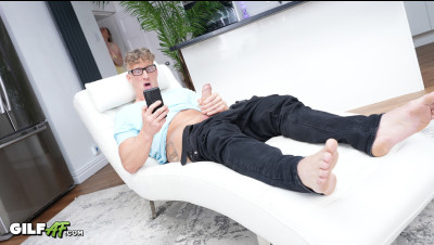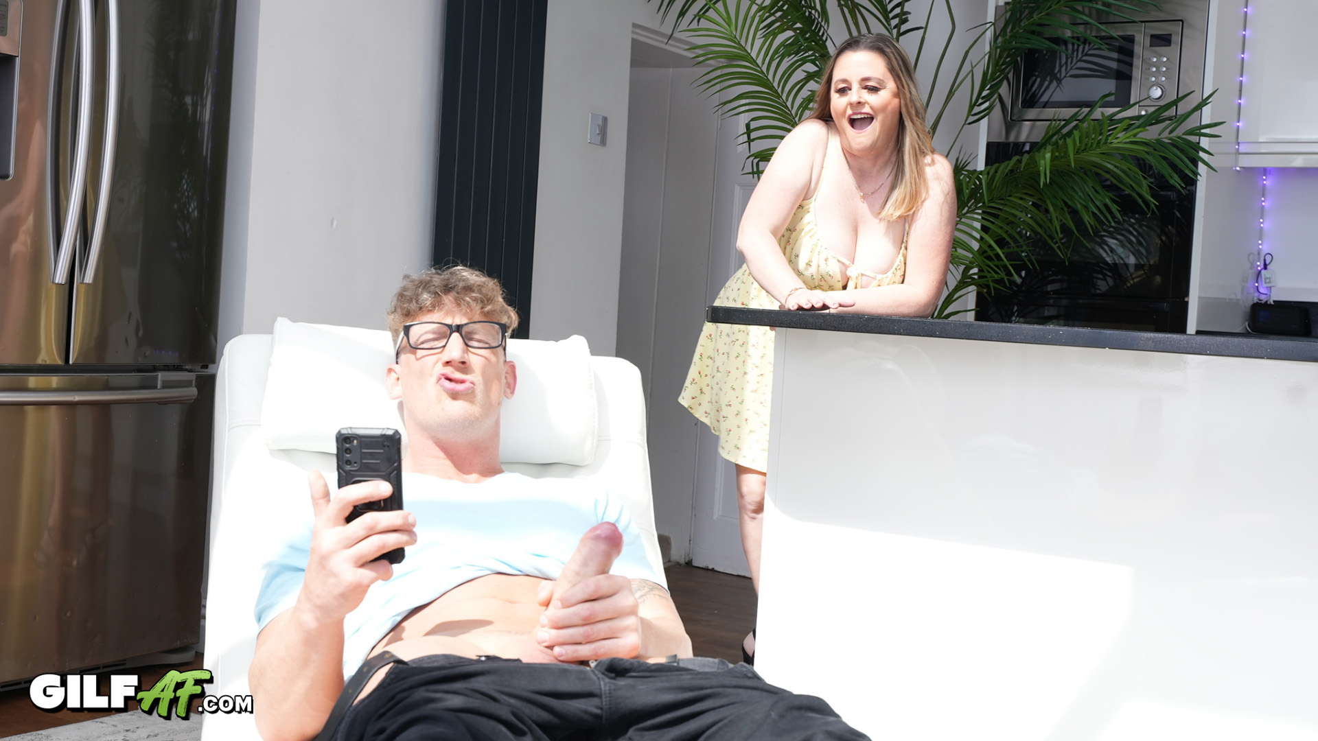 Our man loves his new step-milf Granny Marie X. She's busty, cute, and definitely down to fuck. Our man knows this which is why he starts pumping his prick immediately after she leaves. She returns and busts him in the act but his cock looks so good the horny gilf has to fuck him.