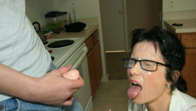 cumshot, handjob, blowjob, facial, brunette, milf, glasses
