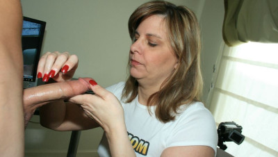 Frankie acctidentally catches Billy masturbating. She notices how nice his cock is and decides to join in by helping him jack off to his favorite porno. Billy kicks back watching his favorite porn vid while Frankie helps bust his nut all over himself!