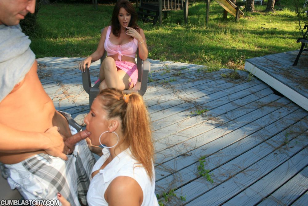 Mrs. Steele and Mrs. Starr see Jimmy wanking his wood, again right in public. In order to releive him the two curious milfs decide to milk him dry by sucking him off and taking turns blastig each other faces with his spunk.